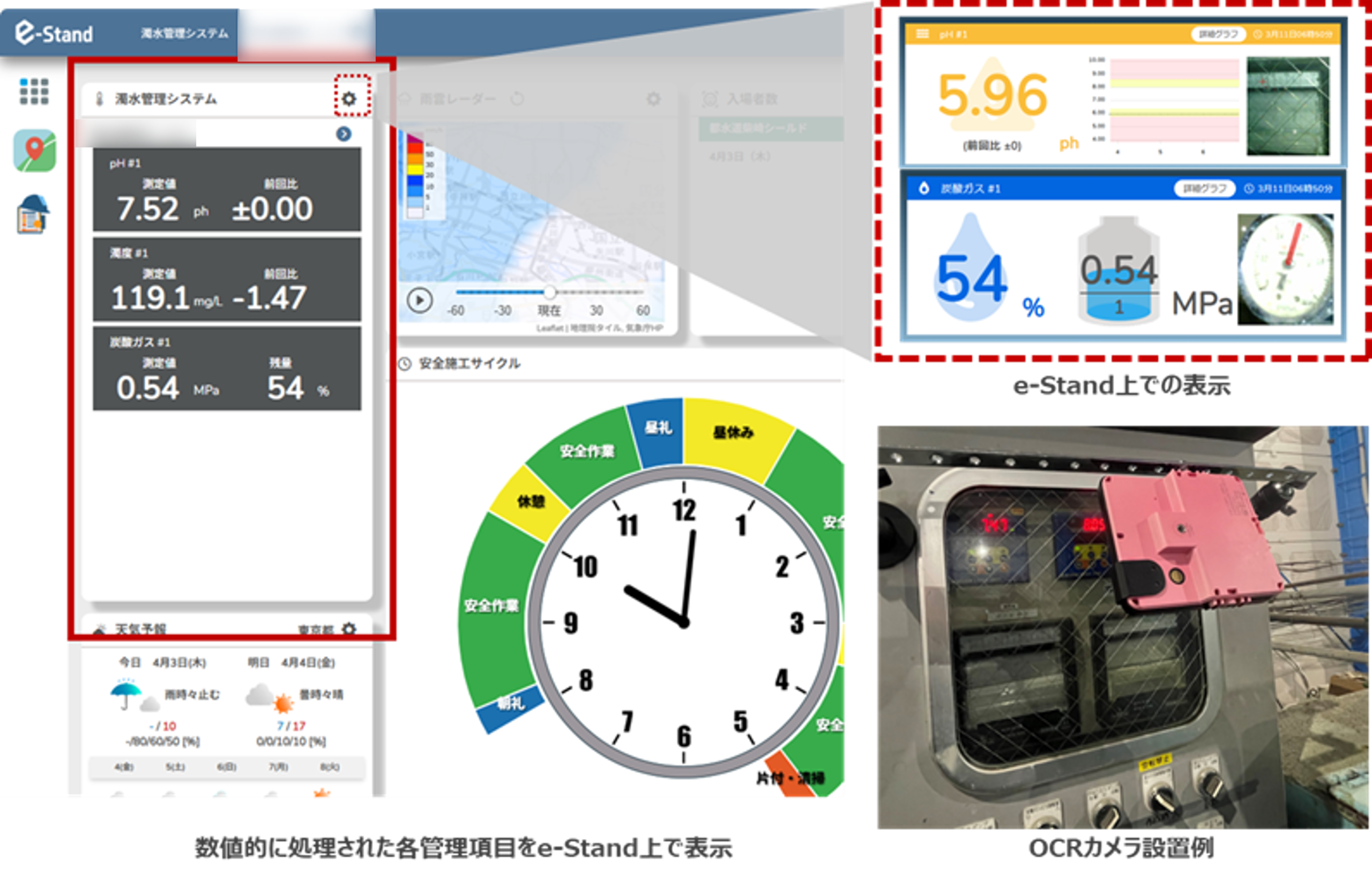 濁水処理施設の排出値や薬剤の残量は通常、アナログメーター等で管理され、担当職員による現認が必要でした。当アプリはアナログメーター等をOCRカメラ※で読み取り、数値化することで、データの自動共有と遠隔可視化、設定した値によりアラートの発報を行い、担当職員に知らせます。