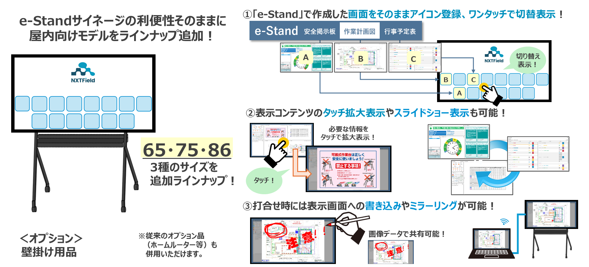 株式会社ネクストフィールド(本社:東京都渋谷区、代表取締役社長:中川 勲治、以下「ネクストフィールド」)は、2025年12月10日に提供を開始した「e-Standサイネージ」の新たなラインナップとして、(屋内型液晶タッチ式65インチ、75インチ、86インチ、) の提供を2026年2月20日より開始しました。