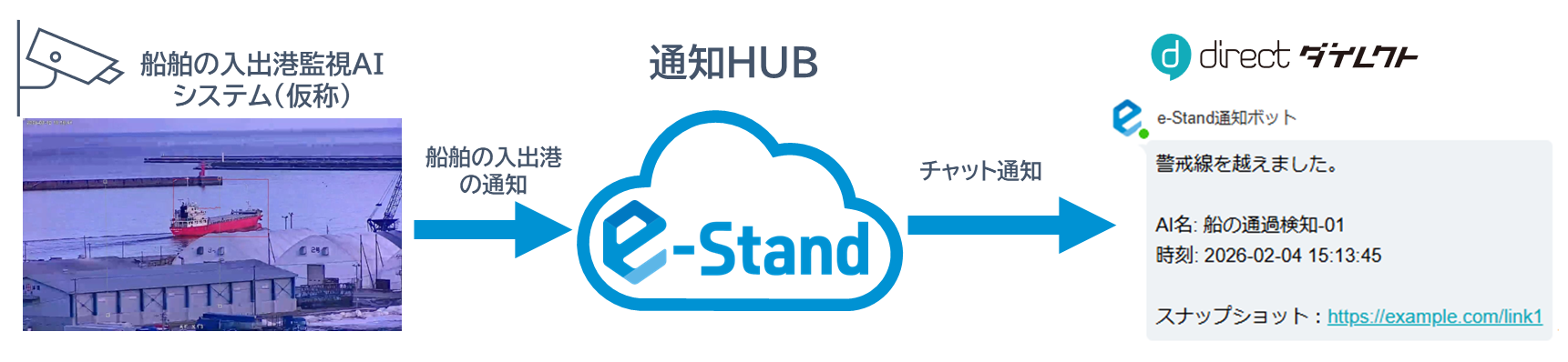 今回の実証実験では、アーキットのAIカメラを活用した「船の入出港監視AI(仮称)」を導入することにより、従来目視で行われていた船舶の監視業務を画像解析AIで自動化を行い、メール・回転灯による通知の他、e-Standの通知HUB機能を通じてdirectへ通知することで、現場運用における有効性の確認を行いました。